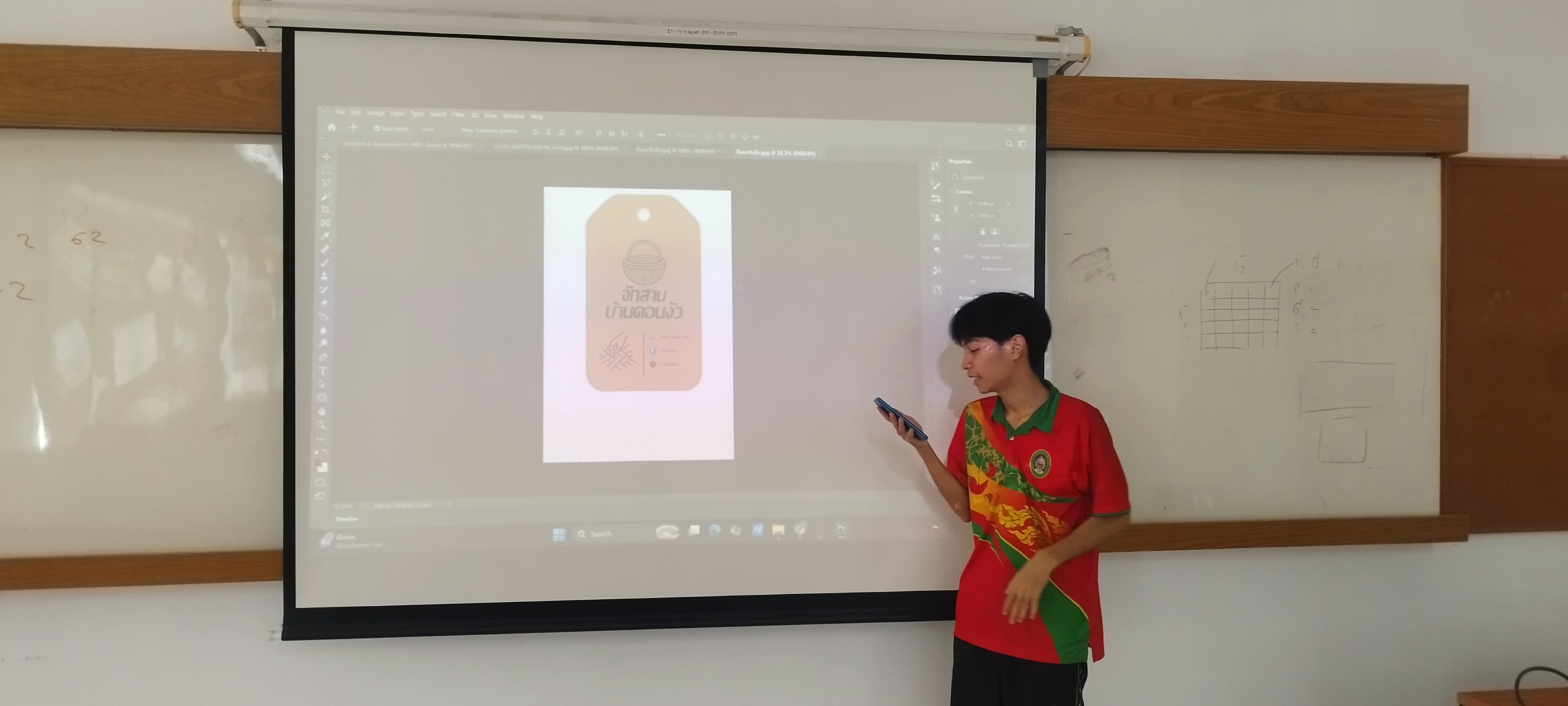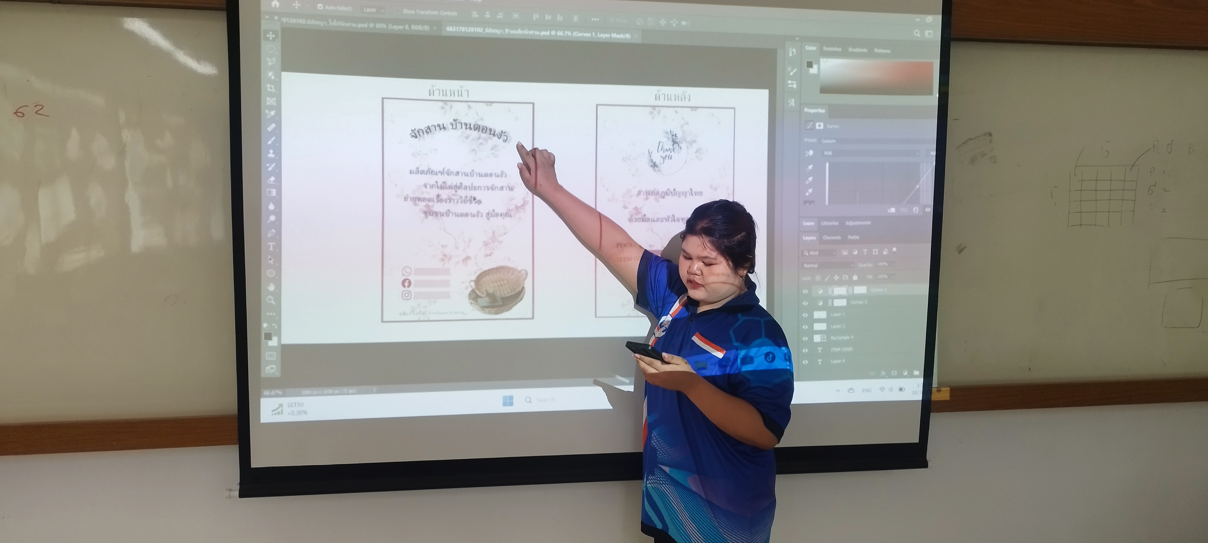 นักศึกษานำความรู้จากรายวิชามาใช้ในการออกแบบสื่อกราฟิกและงานสร้างสรรค์ที่สะท้อนอัตลักษณ์ของสินค้าชุมชน เช่น ออกแบบ โลโก้ แพ็กเกจจิ้ง และฉลากสินค้า สำหรับผ้าทอมือและเครื่องจักสาน ออกแบบ สื่อประชาสัมพันธ์ออนไลน์ (โปสเตอร์ แบนเนอร์ อินโฟกราฟิก หรือคลิปวิดีโอ) เพื่อส่งเสริมการขายสินค้าชุมชน