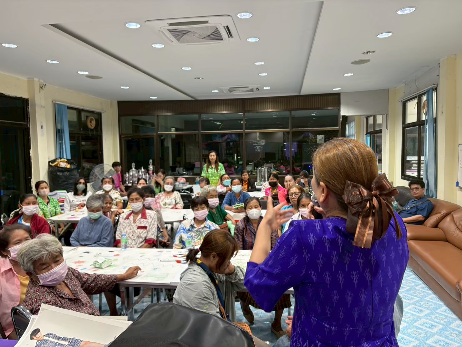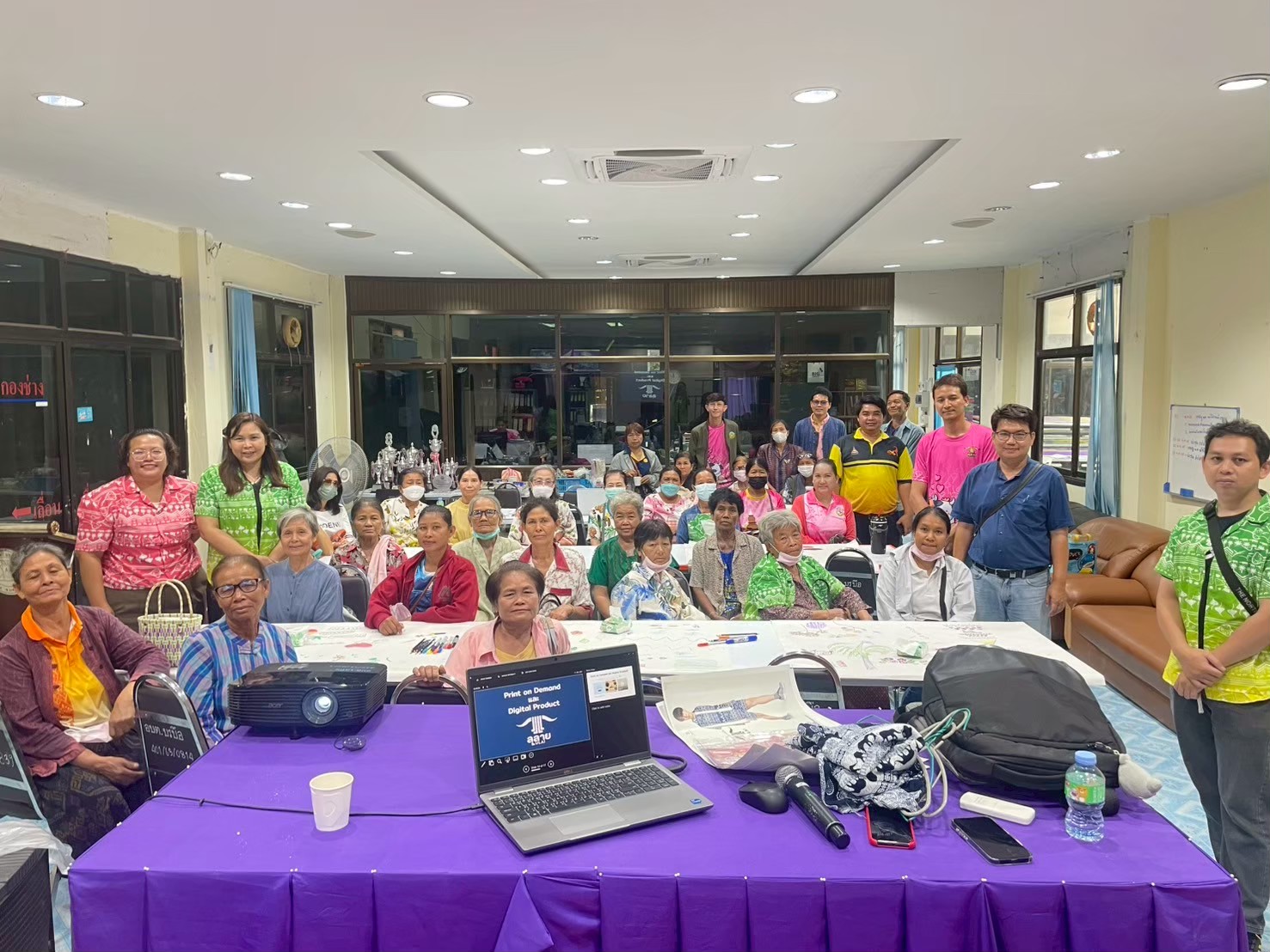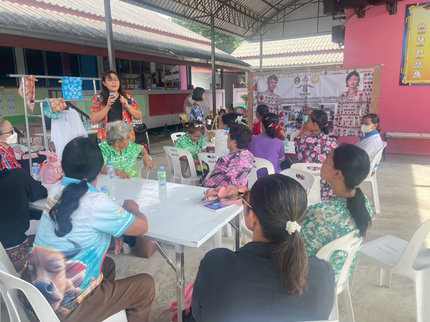 คณะผู้ดำเนินโครงการจัดอบรม โดยวิทยากร ผศ.ดร.จารุวรรณ เอกสระพัง และ ผศ.ดร.ไอยลัดดา โอ่งกลาง มุ่งเน้นการสร้างความเข้าใจในแนวคิดการเป็นผู้ประกอบการสมัยใหม่ (Entrepreneurship) การกำหนดราคา การคำนวณต้นทุน และการทำบัญชีรายรับรายจ่ายอย่างง่าย นอกจากนี้ ยังมีการฝึกปฏิบัติการสร้างร้านค้าออนไลน์เบื้องต้นบนแพลตฟอร์มต่างๆ เช่น Facebook, Instagram และการถ่ายภาพสินค้าให้มีความน่าสนใจ นอกจากนี้คณะผู้ดำเนินโครงได้จัดทำกิจกรรมการพิมพ์ลายผ้าให้แก่ผู้เข้าอบรมเพิ่มเติม