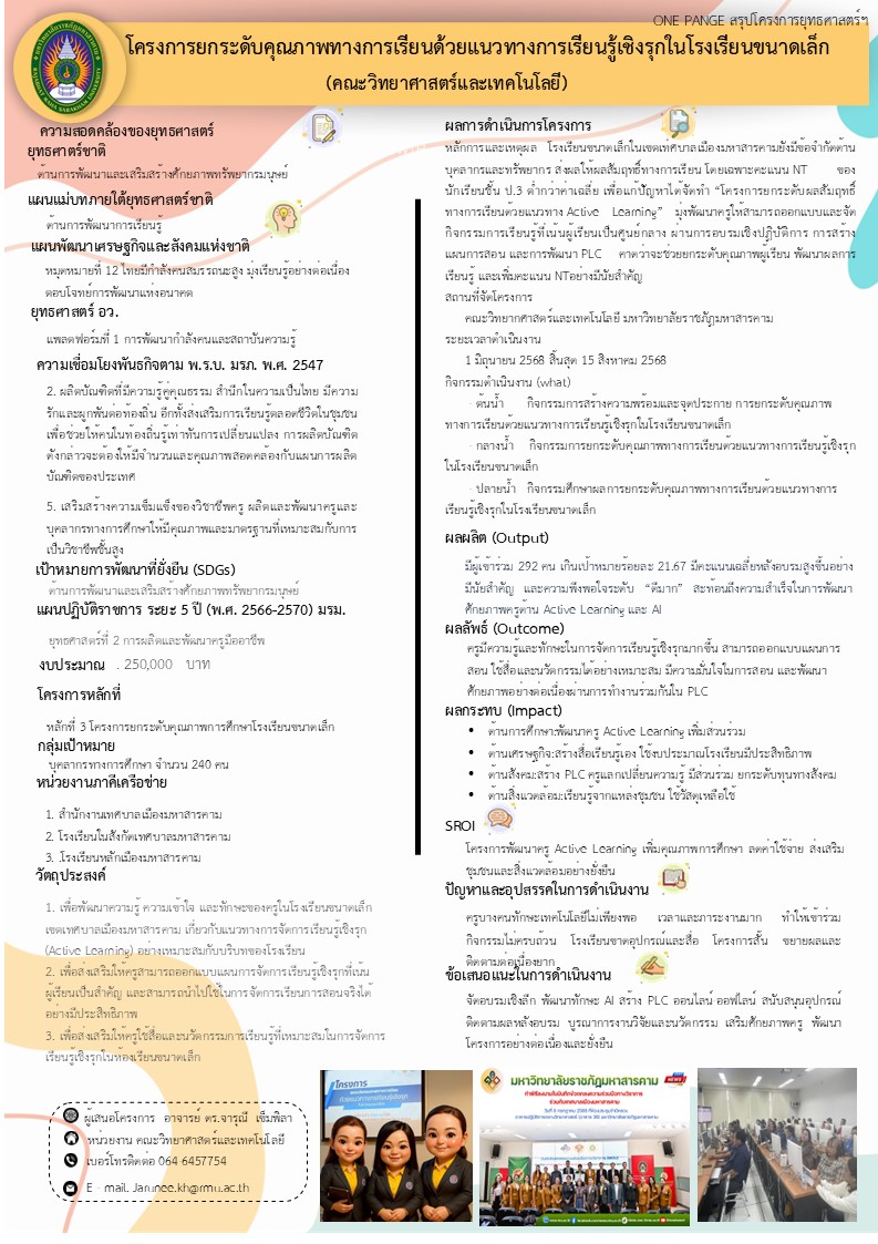 1 เพื่อพัฒนาความรู้ ความเข้าใจ และทักษะของครูในโรงเรียนขนาดเล็ก เขตเทศบาลเมืองมหาสารคาม เกี่ยวกับแนวทางการจัดการเรียนรู้เชิงรุก (Active Learning) อย่างเหมาะสมกับบริบทของโรงเรียน