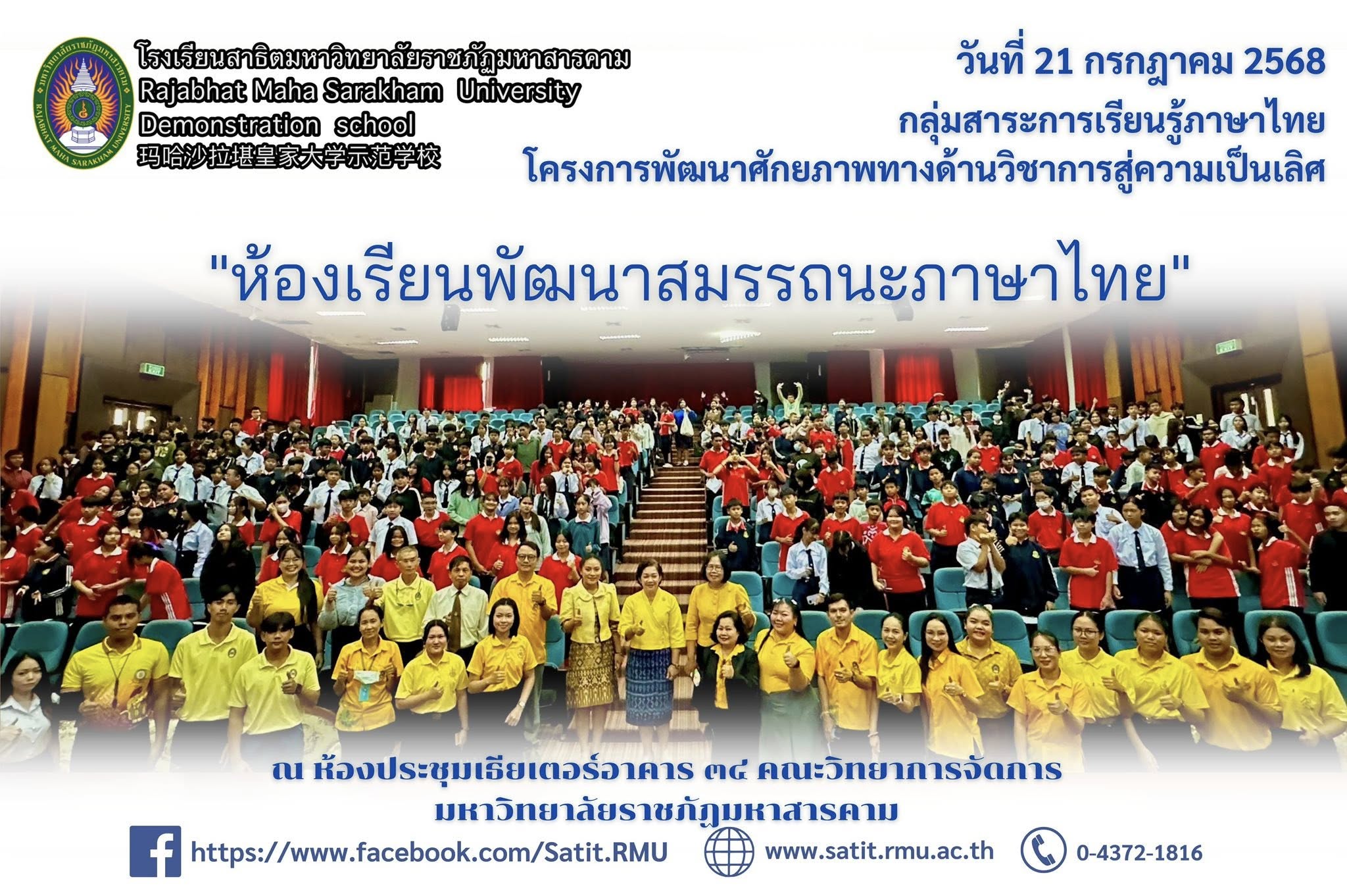 พื้นที่ดำเนินงาน : โรงเรียนสาธิตมหาวิทยาลัยราชภัฏมหาสารคาม ตำบล ตลาด อำเภอ เมืองมหาสารคาม จังหวัด มหาสารคาม 44000