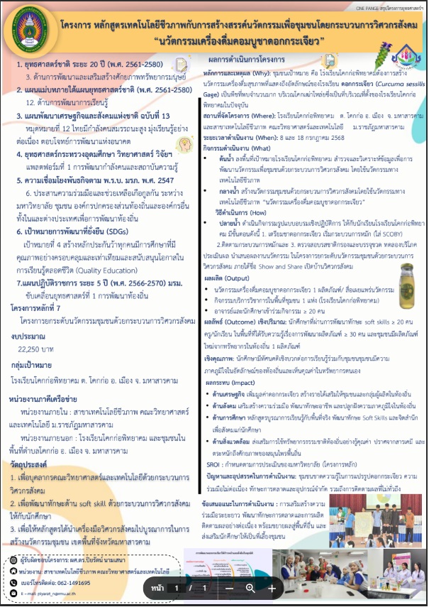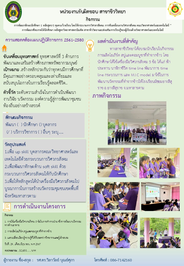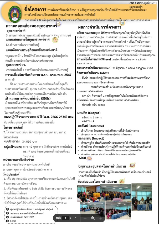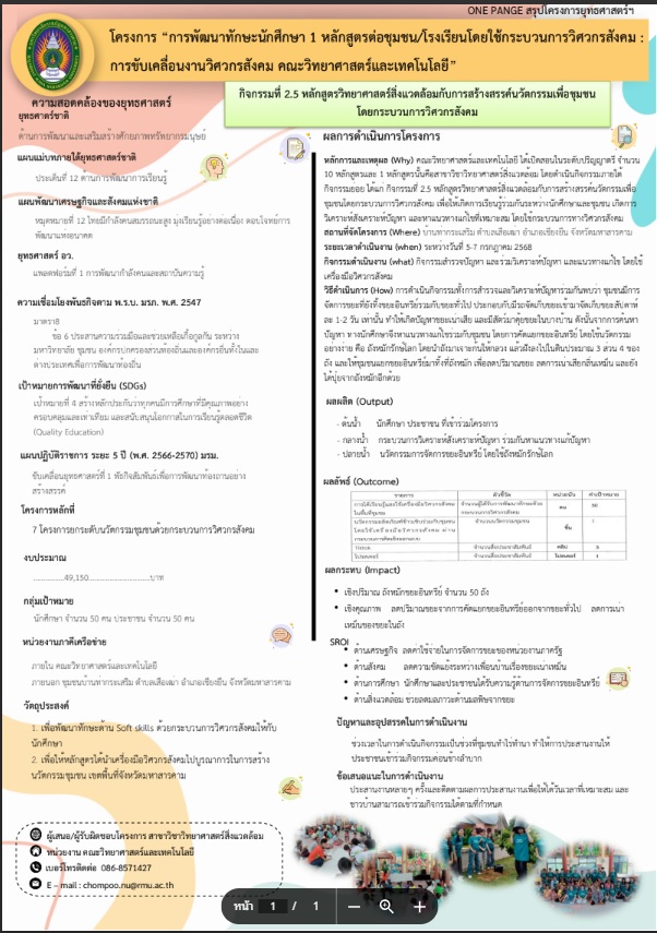 โครงการพัฒนาทักษะนักศึกษา 1 หลักสูตร ต่อ 1 ชุมชน/โรงเรียน โดยใช้กระบวนการวิศวกรสังคม คณะวิทยาศาสตร์และเทคโนโลยี