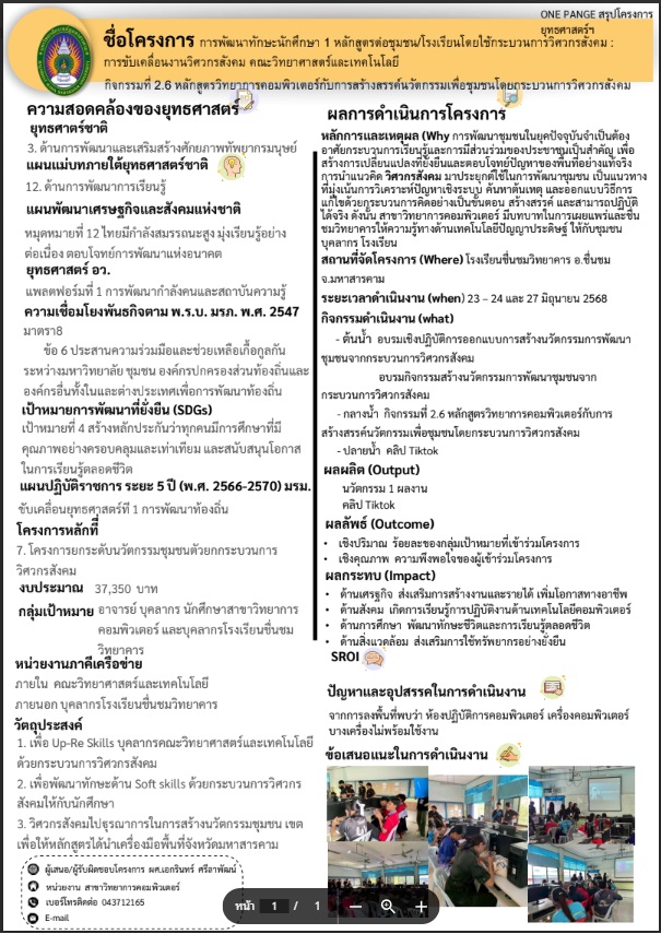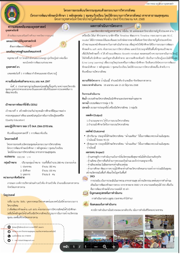 โครงการพัฒนาทักษะนักศึกษา 1 หลักสูตรต่อ 1 ชุมชน/โรงเรียน โดยใช้กระบวนการวิศวกรสังคม ก่อให้เกิดผลกระทบเชิงบวกต่อชุมชนและสังคมอย่างเป็นรูปธรรม ชุมชนได้รับการพัฒนาอย่างมีระบบจากการร่วมคิด ร่วมทำกับนักศึกษา เกิดนวัตกรรมที่ตอบโจทย์ปัญหาในพื้นที่ เช่น การพัฒนาผลิตภัณฑ์ การจัดการสิ่งแวดล้อม หรือการส่งเสริมการเรียนรู้ ขณะเดียวกันชุมชนมีความตระหนักรู้และมีส่วนร่วมในการพัฒนาอย่างยั่งยืน สร้างเครือข่ายความร่วมมือระหว่างสถาบันการศึกษาและท้องถิ่น นำไปสู่การยกระดับคุณภาพชีวิตและสังคมที่เข้มแข็งในระยะยาว