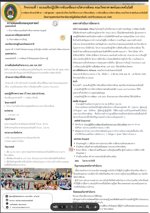 1. กิจกรรมอบรมเชิงปฏิบัติการขับเคลื่อนงานวิศวกรสังคม คณะวิทยาศาสตร์และเทคโนโลยี